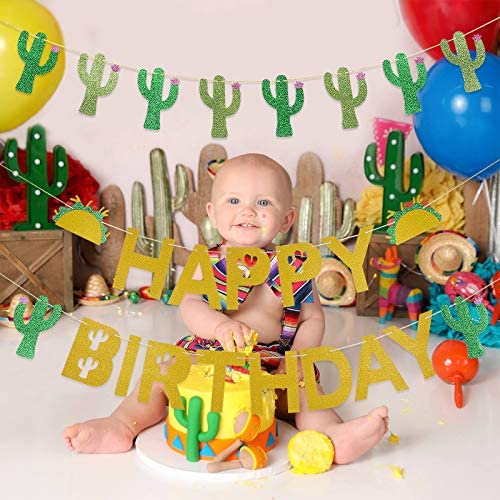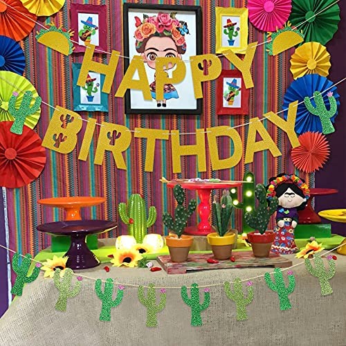 Gold Glitter Happy Birthday Banner and Cactus Garland Banner for Mexican Themed Birthday Party Decorations, Fiesta Birthday Banner, Taco Birthday Party Decorations Supplies