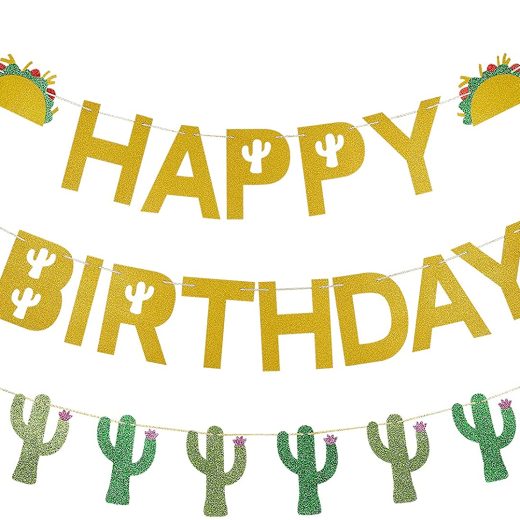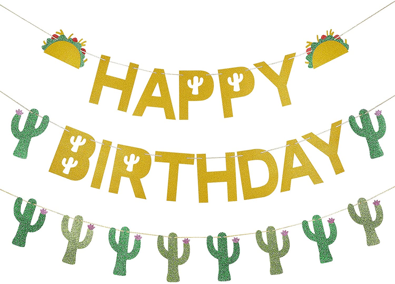 Gold happy birthday banner + Cactus Garland Banner for Taco Party Decor
