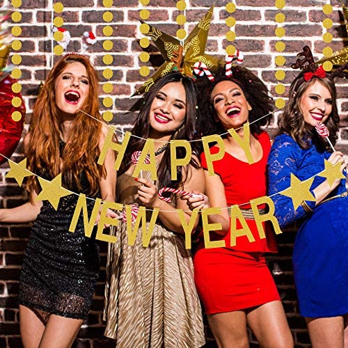 Gold Glitter Happy New Year Banner and Circle Dots Garland,New Years Eve Party Supplies 2022,Happy New Year Decorations 2022,NYE Decorations 2022,New Years Fireplace Mantle Decorations,Cheers to 2022 New Years Party Decorations Supplies