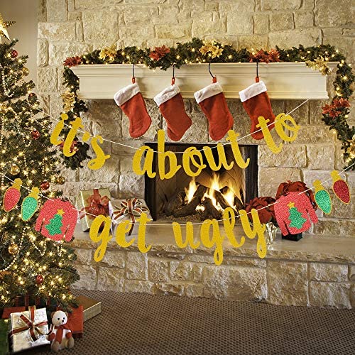 Gold Glitter Its About To Get Ugly Banner,Ugly Sweater Party Decorations,Christmas Party Decorations,Grinch Christmas Decorations