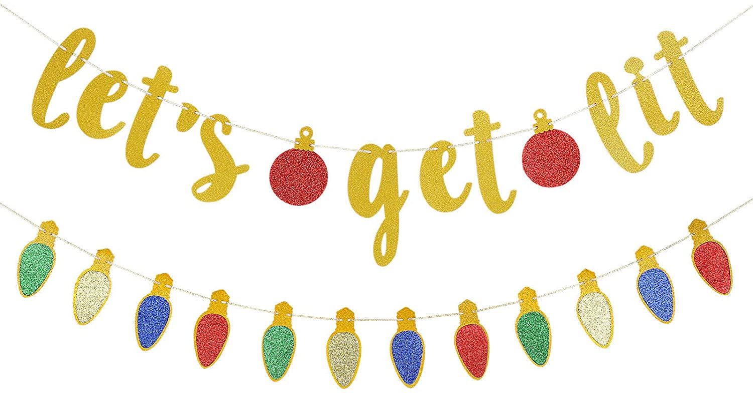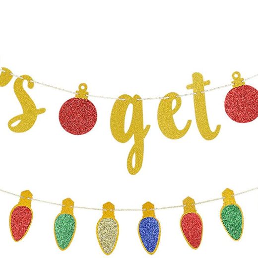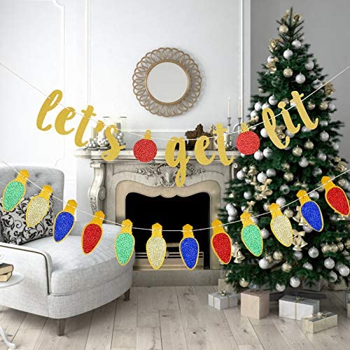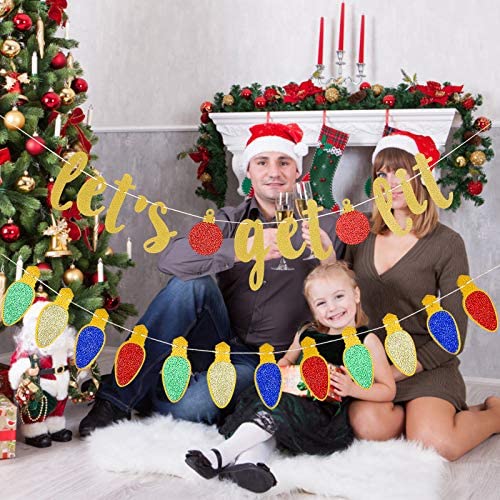 Christmas Party Decor: Unique font and colorful christmas light bulb ,full christmas holiday season feeling.It is a must-have garland to brighten up your home, office or outdoor anywhere you want. Package Include: 1pcs Gold Glittery Lets Get Lit banner and 1 pcs colorful christmas light bulb garland.It will look amazing on your party,adding a little sparkle to your christmas holiday party. Easy To Assemble: Its very simple and just place a ribbon through the hole at the top of each letter cardstock,a little DIY.You can use it as an excellent backdrop or photo prop to decorate the home, office, fireplace, mantle, wall, dessert table, lawn, tree and anywhere you like.Create a completely warm Xmas party atmosphere. High Quality: Made of glittert eco-friendly cardstock and and the colors are very vibrant, the glitter doesn’t come off.The Gold Glittery Lets Get Lit banner letter length approx is 6.6,light bulb size is 2.6 width x 5.9 height. Worth Buying It: This christmas Lets Get Lit banner will create a cheerful atmosphere for your christmas party and highlight your gathering,your family and friends will love it.Buy it now!