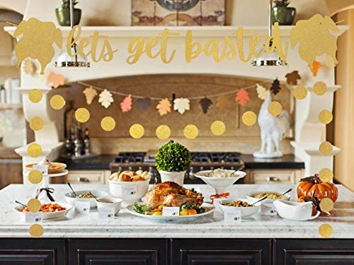Gold Glittery Letu2019s Get Basted Banner, Thanksgiving Party Decorations, Funny Friendsgiving Banner Garland Sign, Autumn Fall Party Supplies Decorations