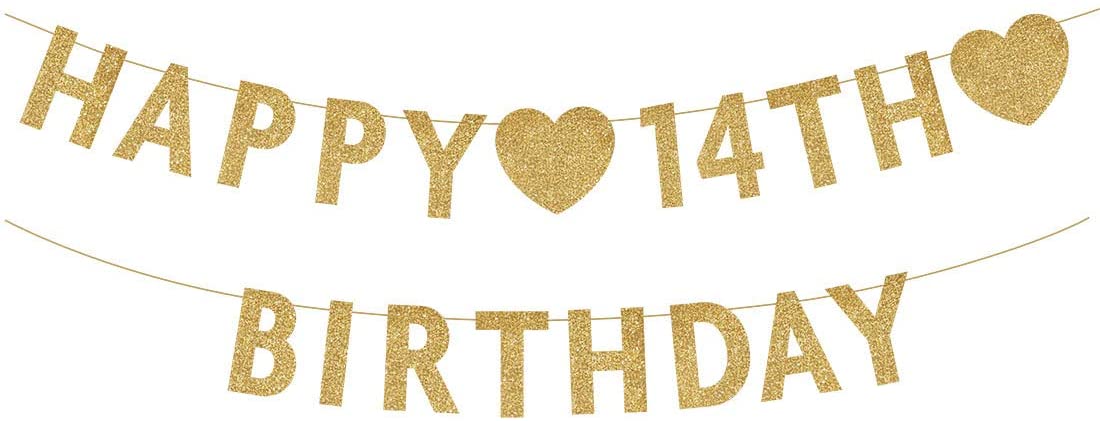 Gold Happy 14th Birthday Banner, Glitter 14 Years Old Boy or Girl Party Decorations, Supplies