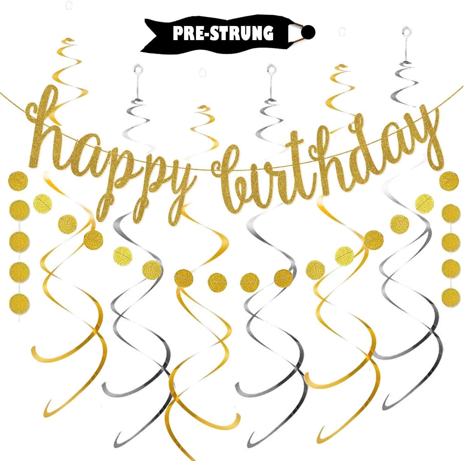 Gold Happy Birthday Banner Decoration Kit, Gold Glittery Birthday Banner Circle Dots Garland with Gold Silver Hanging Swirls for Birthday Baby Shower Party Decorations Supplies, Pre-Strung