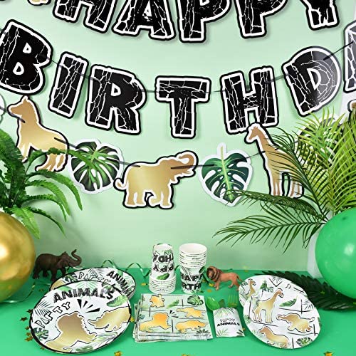 Gold Jungle Safari Happy Birthday Banner – Jungle Animal Theme Birthday Party Decorations for Boys Kids Wild Safari Party Supplies Garland Pre-Stru…