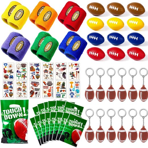 Package Includes 76 Pcs: 12x football key chains 12x football party bags 12x football foam stress ball (4 color) 12x football wrist sweatbands (6 color) 12x dinosaur temporary tattoos Notice: The item may contain small parts, keep away from children under 3 year. If there is any problem with your purchase, please feel free to contact us, we will help to fix the problem.