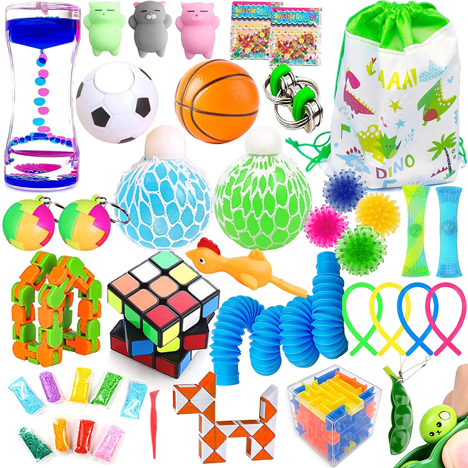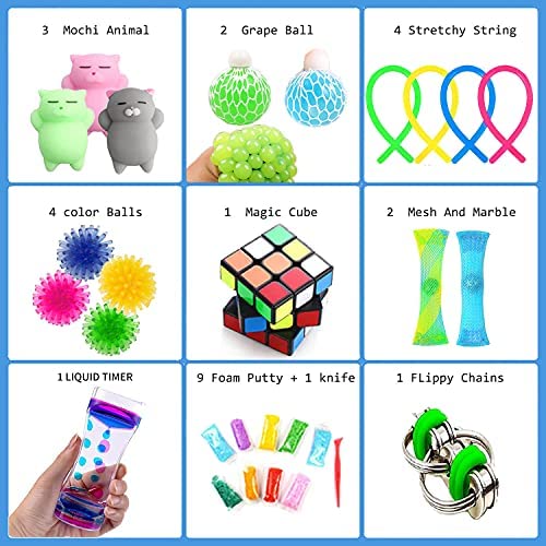 This 40 Pack fidget toys pack: Include 1x Magic Cube, 1 Snake Twist Puzzles, 1 catapult chicken, 1 pop tub, 1 spinner football, 1x Basketball Stress Ball, 1x Snake Cube,1 maze puzzle,1x Liquid Motion Timer, 1x Squeeze Beans , 1 x Chain, 2x Grape Ball, 2x Mesh And Marble , 2 Puzzle Ball, 2x Water Beads,3x Mochi Animal, 4x Stretchy String, 4 color Balls, 10 x Fluffy, with 1 x Storage Bag Great Quality Toys: Each fidget toy through the Certification of ASTM F963 International Toy Standard and with an CPSIA Certificates. These toys are Safty for kids and adults. SENSORY FIDGET TOYS: Suitable For Special Needs.ADD,ADHD,Autism. Great Anti-anxiety toys.It also works well in focusing attention,reducing stress. PORTABLE:small fidget toy easy to take.so that can play in the classroom for the students, Work meetings or travling. Silent Fidgets your anxieties away. It has a storage bag, this fidget toys set can put in the bag. Convenient for collecting and can carry everywhere. Best gift for kids and adults. (Important:Part of them are color random.)