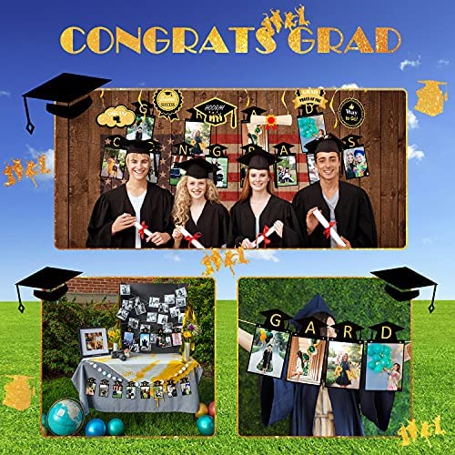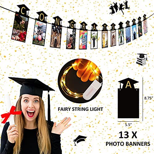 VALUE PACKAGES – ? Graduation Photo Banner: There are 13 frames in total (stickers included). Perfect for displaying your photos from kindergarten to university! ? 6 Hanging Swirls (Black, sliver, gold) & 6 Paper Cutouts include way to go, congrats grad, hooray cap etc (Assembly required). ? Warm Led Lights: Mood lighting decor to continue long after sunset. HIGH-QUALITY – ? Made of sturdy cardboard, the photo banner with letters CONGRATS GRAD measures 9.84ft. The frame measures 5”x 7”.Perfect for 4x 4, 4x 6 or 5x 7 vertical photos. Easy to stick the photos to the banner with some glue or adhesive tape. ? Made of user-friendly PVC, the paper cutouts measure approx. 7.8×5.9. OUTDOOR & INDOOR DECOR – Equipped with a 7ft warm white string light, perfect for indoor and outdoor engagement graduation party decorations. Made of a soft bendable silver wire, easy to bend it to any shape or wrapped it on the banner. EASY TO SET UP – Hang it across a party table, tape to a wall/window, from the ceiling, or string across a fence or between tree branches, etc. Assembly required. Comes with a long rope and self-adhesive back tapes, just paste the photo on each cardstock. MULTI-SCENES – Suitable for graduation party favor, grad party decorations, grad outdoor decorations and grad yard sign decorations. Celebrate your graduation party with this one of a kind photo banner!Perfect touch for your 2021 grad party celebration decorations.