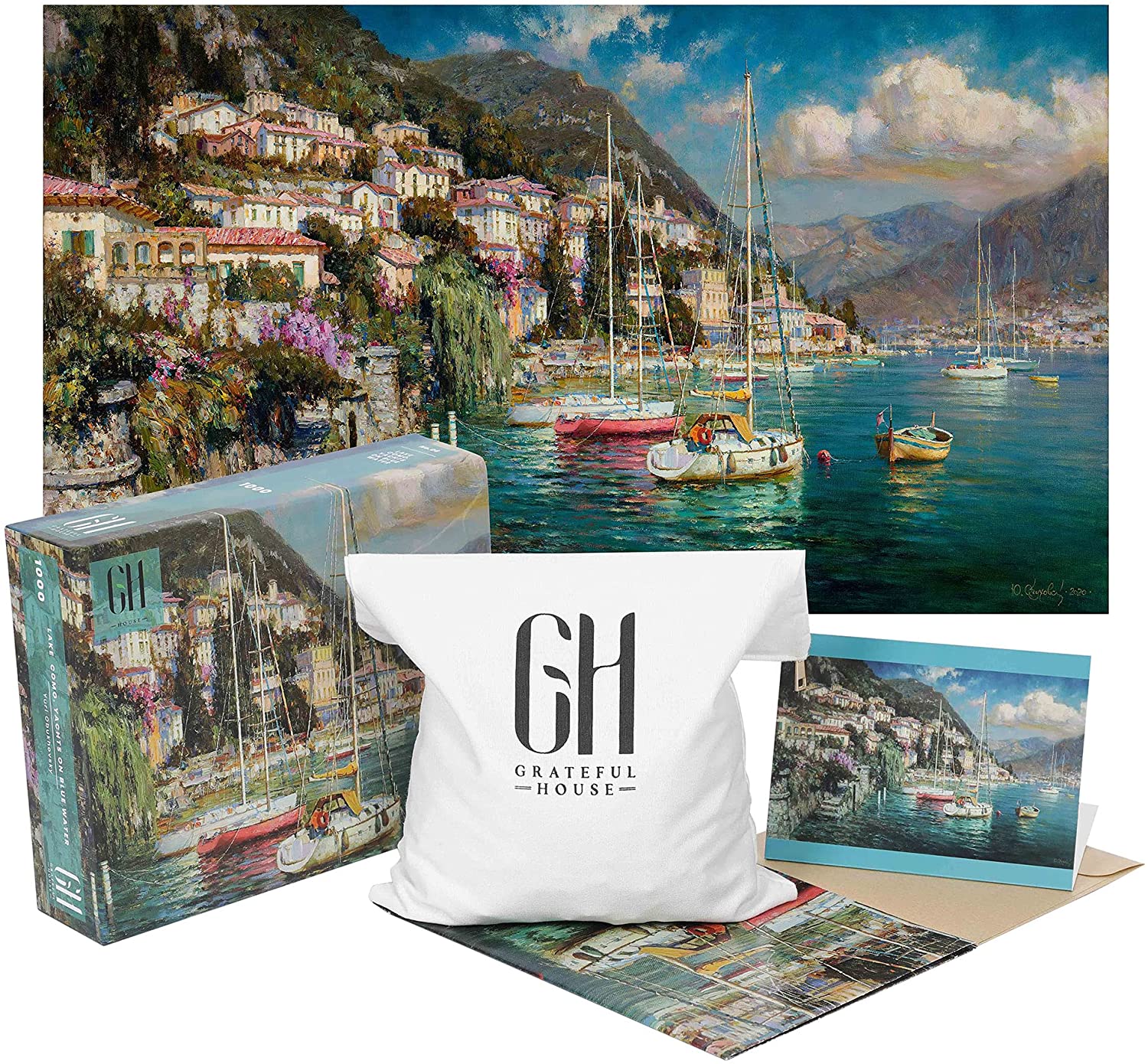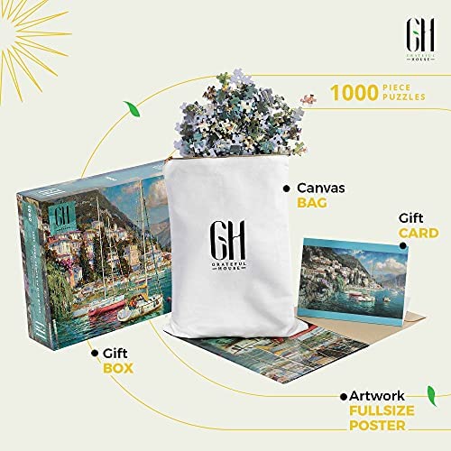 Grateful House Puzzles for Adults 1000 Piece. Jigsaw Puzzle of Lake Como. Premium Blue Board Pieces. Comes with a Storage Bag, Full-Size Image Poster, and Gift Card. (Special Edition)