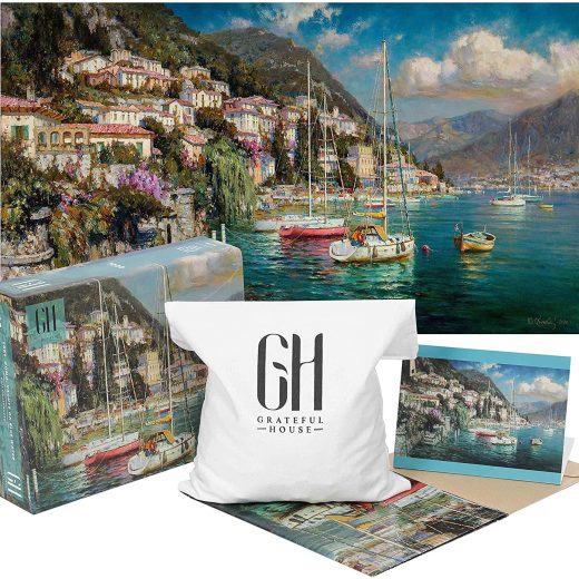 ENJOY this challenging yet tranquil and relaxing 1000 piece puzzle of Lake Como in Northern Italy. Painted by Russian artist Yuri Obukhovskiy it is a special edition to the Grateful House Jigsaw Puzzle range. YOU will love the feel of these puzzle pieces. Made from a high-quality compressed blue board they ensure a seamless interlocking fit that snaps into place. The pieces have a non-glare matte finish and a premium linen surface. ARTIST PROFILE on each box. Grateful House has teamed up with some exceptionally talented artists to bring you some truly great jigsaw puzzles that you will love doing and collecting. TIME alone puzzling, or quality time puzzling with friends and family is very healthy for the mind. Either way, you will love puzzling, collecting or gifting a unique premium crafted Grateful House Puzzle. CHECK-OUT some of the amazing high-quality puzzle accessories from Grateful House today!!
