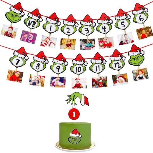 What you will get: 1Pcs grinch photo banner for newborn to 12 months(15 pieces of photo cardstocks) and 1pcs grinch Christmas 1st birthday cake top…