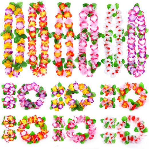 GWHOLE 48 Pack Hawaiian Leis Necklace Flower Garlands Set Luau Party Decorations, Including 24 Bracelets 12 Headbands and 12 Necklaces for Luau Hawaiian Beach Party Favors
