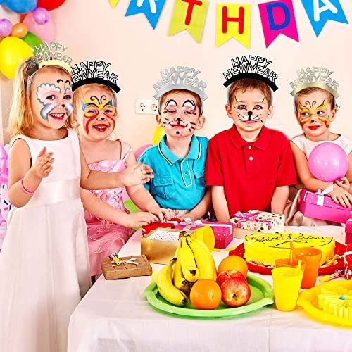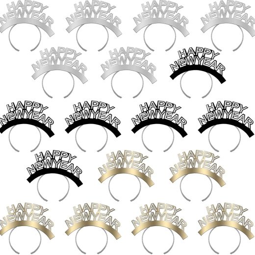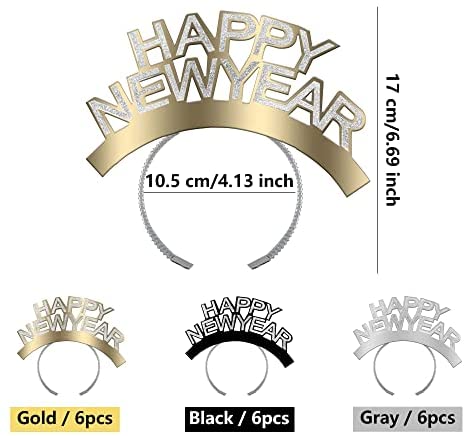 Haconba 18 Pack HAPPY NEW YEAR Headband Glitter Tiara Head Hoop for New Years Eve Gift Party Favors Photo Prop, 3 Colors Wide application: the happy new year headbands are great for various occasions such as New Years Eve parties, New Years parties, masquerades, carnival, stage shows, theater performances, theme parties and more, you can also use them as photo props or gifts, create more happiness Specification: Material: aluminum foil paper and cardpaper Color: silver, black and gold Size: approx 17 x 12 cm/ 6.69 x 4.72 inch Quantity: 18 packs Package include: 6 x Silver HAPPY NEW YEAR Headband 6 x Gold HAPPY NEW YEAR Headband 6 x Black HAPPY NEW YEAR Headband