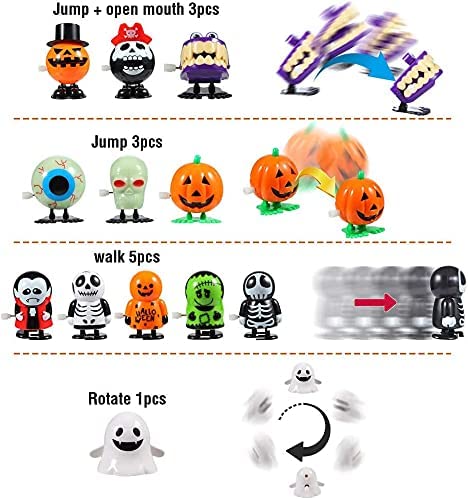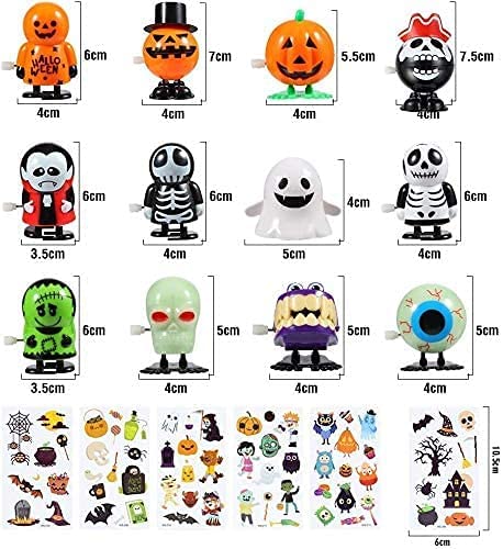 WIND UP TOY SET: 12 pcs Assorted wind up toys and 6 pack Temporary Tattoo stickers, this is super value Halloween toy set. VARIOUS CHARACTERS: 12 pcs Wind Up Characters Include Pumpkins, Vampire, Mummy, Eyeball, Skull, ghosts, etc, all with vibrant colors. 6 pack Temporary Tattoo stickers with more than 60 different design, stick them on your body, hands, faces and arm you like. MULTIFUNCTION: These wind up toys can walking, bouncing, Rotate, flip, flutter, after tighten the metal spring. These toys, including Glow in Dark Eyeball, the Skull Pirate and The Vampire Fang Open and Close Mouth while Jumping, etc. SAFE MATERIAL: All the wind up toys and tattoo stickers are made of non-toxic material, they are safe for your children. The wind up toys are mainly made of Strong quality plastic that will hold for years. KIDS FAVORITE: The Halloween clockwork toy set is perfect Halloween gifts for children, Party Favor, Trick or Treat Handouts, Goody Bag Fillers, birthday gifts classroom incentive rewards, and so on.