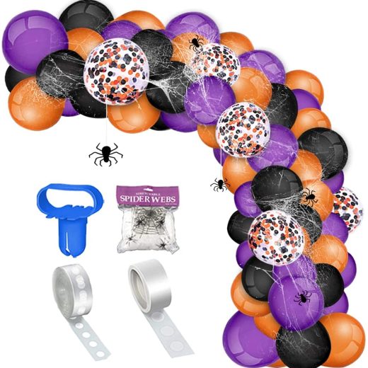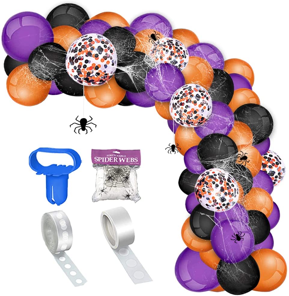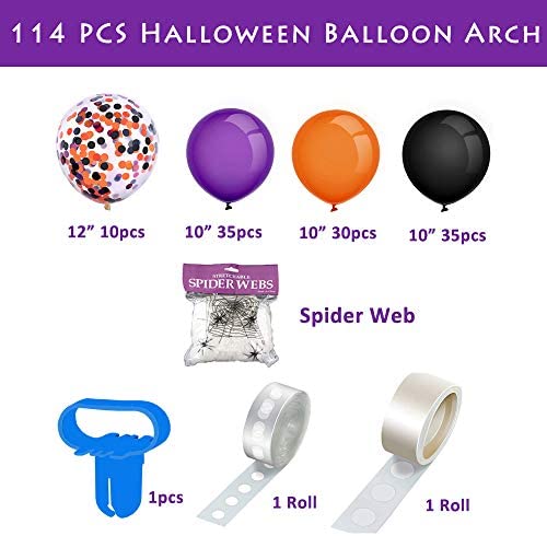 Get Halloween Color Balloons:110 Pcs 10 inch Colorful Balloons of 35 pcs purple, 35 pcs black, 30 pcs orange and 10 pcs 12 inch black gold confetti balloons. 4 Pcs Balloon Arch Kit for 1 spider web, 1 tying tool, 1 roll dot glue and 1 roll balloon tape strip. Must-have balloon kit for Halloween Decorations! DIY Halloween Decoration with Spider Webs: Easy to assemble, spider webs halloween decorations add fun atmosphere. With different sizes, purple, black and orange balloons, create a unique halloween backdrop and have a meaningful and wonderful Halloween party! Tips: Stringing balloons with ribbons will be surprisingly beautiful! Multifunctional ApplicationThe Balloon Garland Kit as necessary Halloween Decor,not only for halloween decorations indoor such as window door wall porch decorations,but also for outdoor halloween decorations such as yard garden party decorations. Deeply attract peoples eyes! Great Quality Balloons Halloween Balloons are made of natural latex and ribbons, pp material. It can last over a week since high quality and durable balloon kit. Pls kindly know that any hole or popped balloons within 1-3 pcs for every 1160 pcs pack is a normal phenomenon, and we are always here if you have any question. TipsPls remember to blow up balloons in advance, because it may takes some time to DIY Halloween Balloon Garland. Due to different display and lighting effects,there may be color difference before and after inflation. Please focus on the color of the balloon after inflation. Wish you have a fun and wonderful Halloween Party!