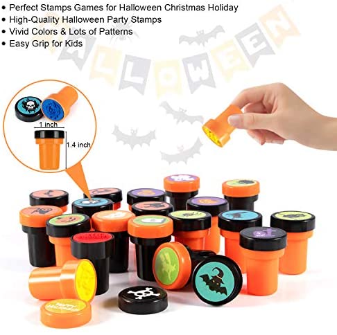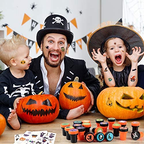 Halloween Toys Value Bundle: 60pcs Halloween stampers for Halloween party favors, includes 25 different patterns pre-inked Halloween plastic stampers. Each Halloween self ink stamp can make a clear and distinctive imprint, with no blurring. And it also equipped with 20 sheets of Halloween themed tattoos. Reliable Material: These holiday assorted stamps for kids Halloween decorations party supplies are made from quality materials that are odorless, non-toxic, safe and washable for you to use. Each Halloween toy stamper is sealed to prevent from drying to be used for Halloween party games. The size of the Halloween stamper is 1.5 x 1. Vivid Colors & Fun Designs: The Halloween toys stamps for kids Halloween party favors decoration come in various colors and designs. 25 different fun designs of trick or treat stampers including ghost, bat, spider, witch, skeleton, pumpkin, and more for the Halloween style. They are an ideal Halloween gift for kids Halloween party. Cute Halloween Tattoos: The Halloween party favors stampers equipped with 20 sheets 192PCS Halloween tattoos stickers, with fun & spooky patterns such as a spider web, creepy castle, mummy, scarecrow, monster, coffin, etc. 10 sheets Halloween temporary tattoos which can glow in the dark. The Halloween tattoos are full of Halloween theme style, deeply loved by children. Ideal Halloween Gift & Satisfied Guarantee: The Halloween stamps for card making also perfect for Halloween Party Games, Party Supplies, Halloween Giveaways, Classroom Teacher Rewards Prizes, Halloween Party Favors, Halloween Goodie Bag Fillers, Halloween Trick or Treat Games, and more occasions. And we offer a full refund or replacement if you are not satisfied with the Halloween toys stampers. Have any problems just contact us.