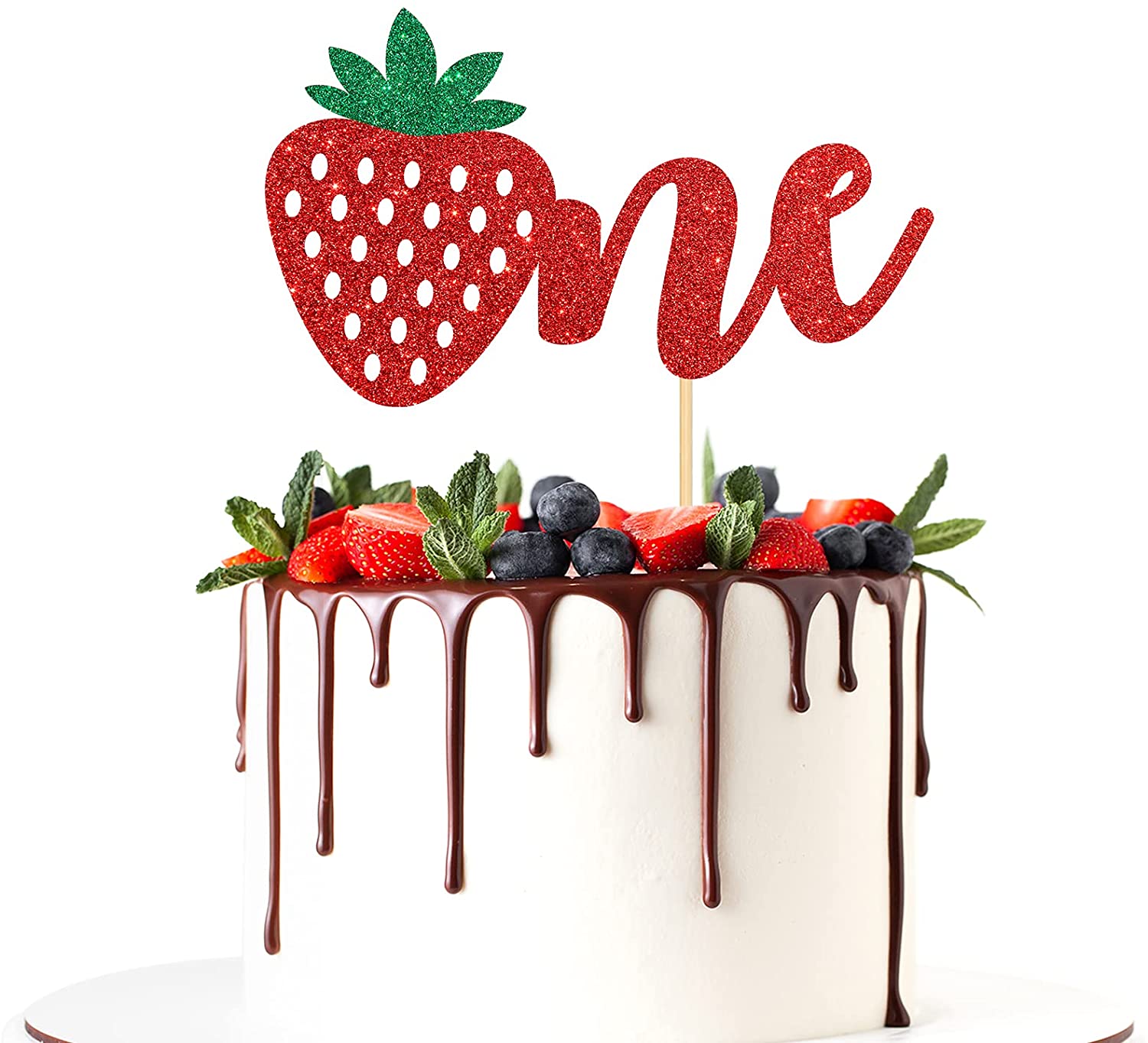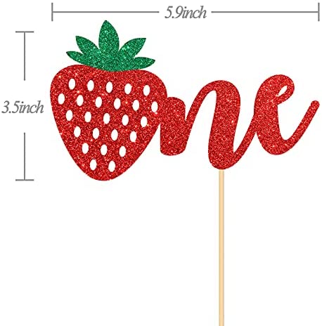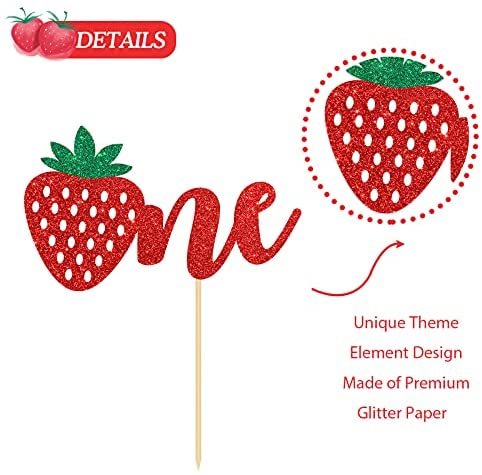 Halodete Strawberry One Cake Topper, Happy 1st Birthday Party Decor, Fruit Themed Cake Picks, Wild One Baby Shower Photo Props – Red & Green Glitter