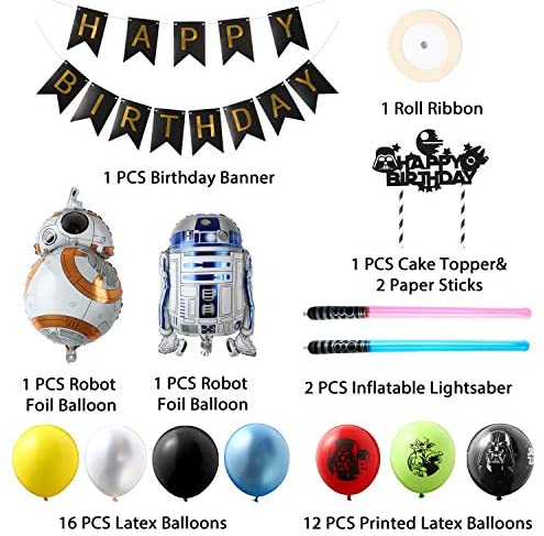 Haooryx 35PCS Galaxy Wars Birthday Party Favor Supplies for Kids, Black Series Birthday Banner Darth Vader Cake Topper Decoration Latex Balloons War Lightsaber BB8 Robot Aluminum Foil balloons