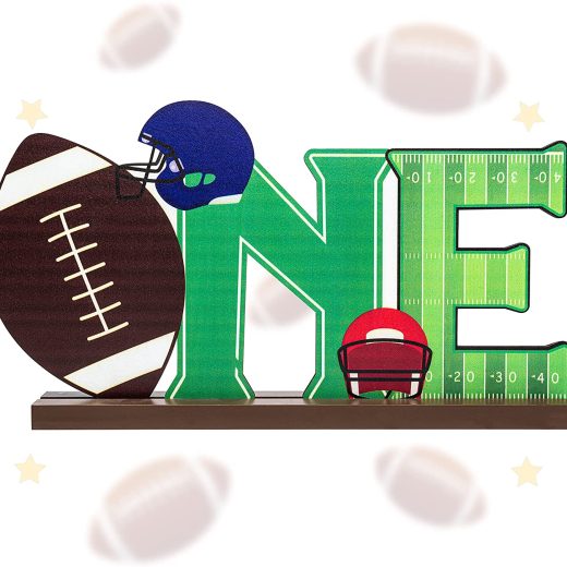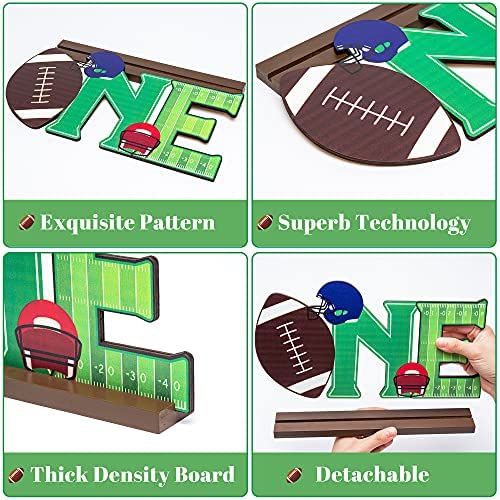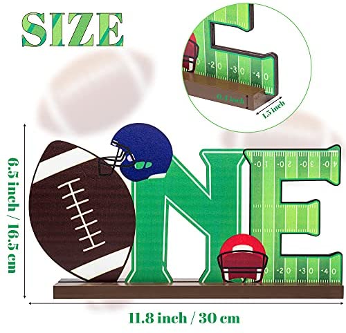 UNIQUE DESIGN: This football ONE letter sign for your childs first birthday party, which has elements of football and football uniform, so as to add interesting atmosphere to your babys birthday party. QUALITY WOOD CRAFT: Our football ONE table centerpiece is made of quality wood and coated with safety paint, which is non-toxic and safe for kids. The exquisite workmanship and good texture, which can serve you for a long time. SUITABLE SIZE: The football wooden table centerpiece measures about 11.8*6.5 inch, the thickness of the base is about 0.4inch. High-density and high-thickness wood crafts can be stored for a long time and are not easy to break. EASY TO ASSEMBLE: The base and board of the center part of the football table are separated, so you can just push the top plate of the table into the slot of the base when installing. The sign and the base can fit well easily and hard to loosen after installation. WIDE APPLICATION: The wooden football ONE letter centerpieces is very suitable for baby boy’s 1-year-old birthday party decoration. Great for dessert table centerpieces decor, photo props, home decor, party decor, or as a gift to your friend.