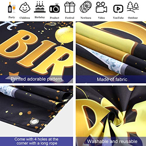 Happy 10th Birthday Banner Horizontal Fabric Black Gold Happy Birthday Sign Banner Backdrop Background Happy Birthday Yard Sign for Kids 10th Birthday Party Decorations Supplies, 71 x 15.7 Inches
