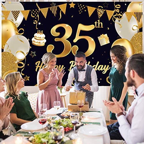 Happy 35th Birthday Party Decorations, Extra Large Black Gold 35th Birthday Party Banner Photo Backdrop Background for Men Women 35th Birthday Anni…