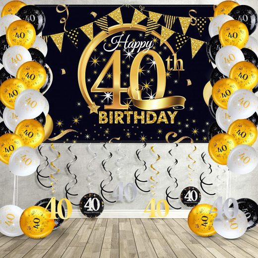 Happy 40th Birthday Party Decorations Kit, Black and Gold Glittery Happy 40th Birthday Backdrop Banner Hanging Swirls Balloon for Men Women 40th Birthday 40 Years Old Party Decorations Supplies