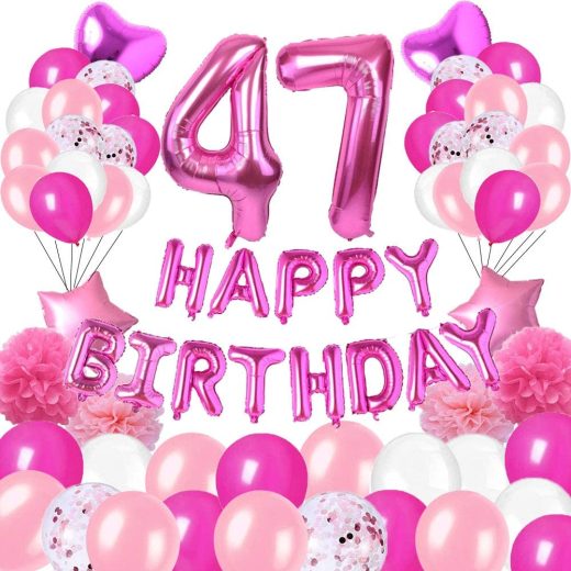 Pink and Rose Red Birthday Decoration Party Supplies Set Decoration, Pink White Rose Red Balloon Birthday Party Decoration, rose red Happy Birthday Banner,Rose Red sequin balloons,Star-Shaped and heart Aluminum Foil Balloon , Pom Pom Flower, Big Number 47 Balloons for men and women 47nd Birthday,Package includes:14 pcs Pink latex balloons,14 pcs Rose Red latex ballons,10 pcs white latex balloons and 8 pcs Rose Red sequin balloons-12inch,2 pcs foil star shape balloons and 2 pcs foil heart shapes balloons-(18inch),4 pcs Pom Pom Flower Balls (Dark Pink and light pink,each 2 ) -10 inch,2 set foil number balloons47-32inch, 1 set Rose Red HAPPY BIRTHDAY banner,Several straws and ropes.