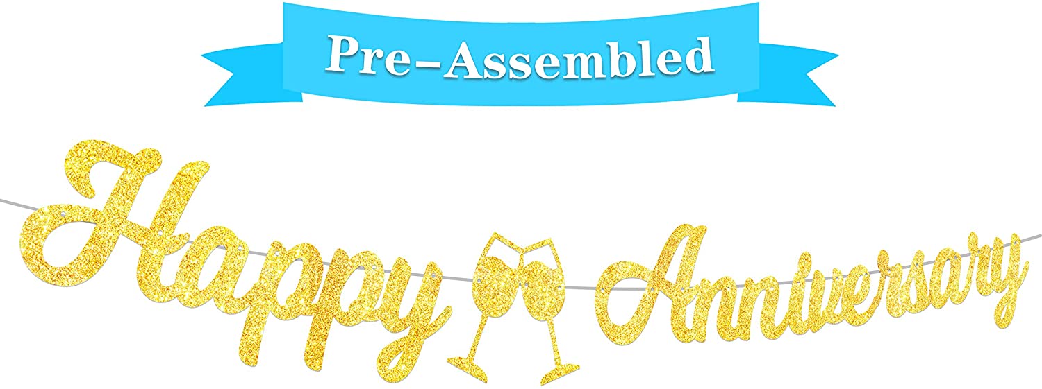 Happy Anniversary Banner Gold Glitter Wine Glass for Cheers & Beers Theme Decor Wedding Anniversary Bunting Garland Party Decorations Supplies