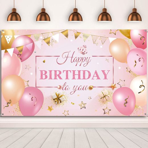 Happy Birthday Banner Large Pink and Gold Birthday Backdrop Stars Balloons Golden Glitter Happy Birthday Decoration Banner Backdrop Photo Booth Props Theme Supplies for Girl Women Birthday Party