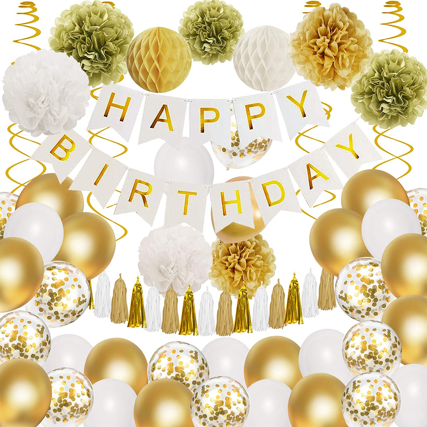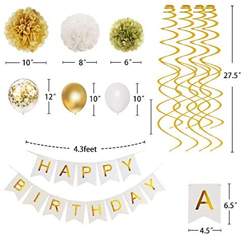 Happy Birthday Party Decorations Set, Gold Birthday Decorations with Happy Birthday Banner, Paper Flowers, Confetti Metallic Latex Balloons, Hanging Swirls for Kids Girls Women Birthday Party Decor
