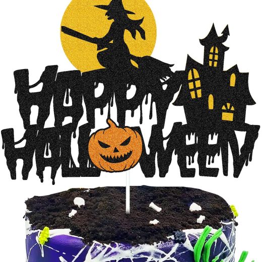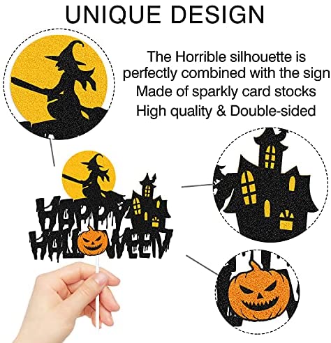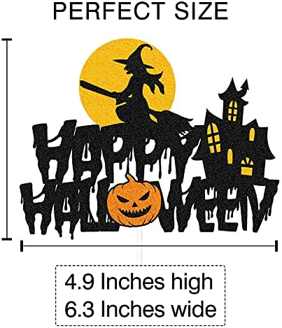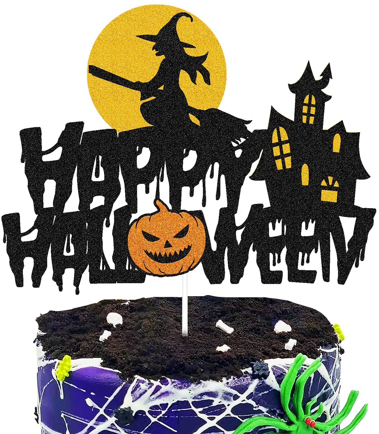 Happy Halloween Cake Topper for All Saints Day Horror Wizard Witch Ghost Pumpkin Haunted Spooky House Boo Tombstone Zombie themed Boys Girls Men Women Halloween Festival Party Decorations All Souls Day Celebration Decor Glitter Black Supplies