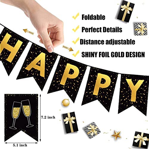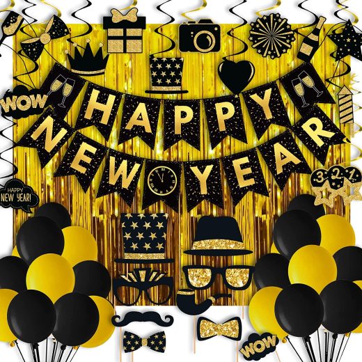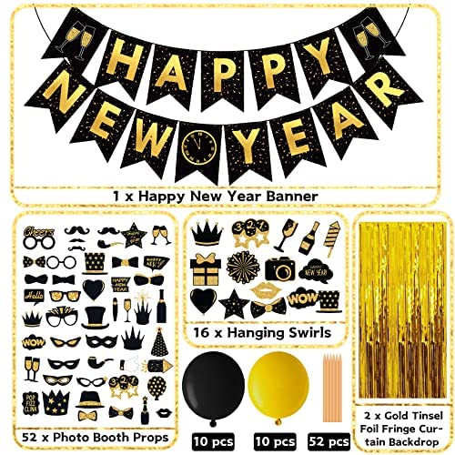 Happy New Year Eve Party Kit Pack of 91, 2022 Black and Gold Themed Happy New Year Decorations Kit – New Years Eve Photo Booth Props, Balloons, Hanging Swirls, Golden Foil Fringe Curtains, Happy New Years Banner