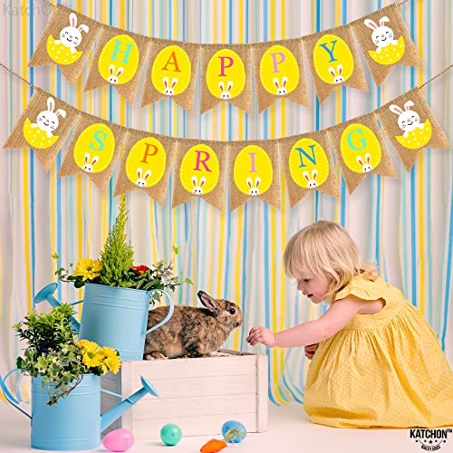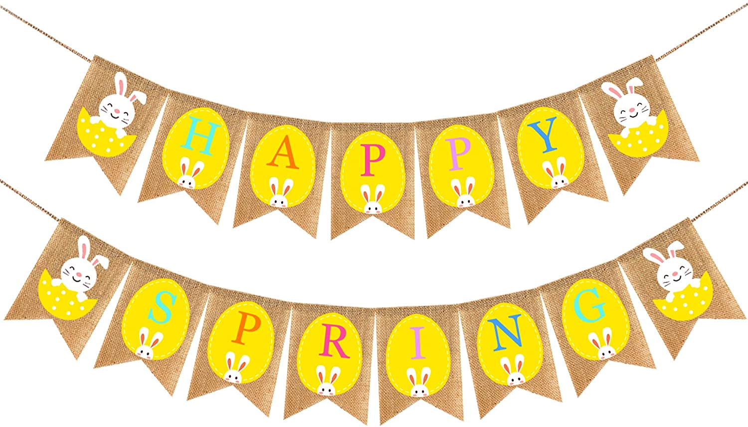 BRING IN THE FEELING OF SPRING WITH SPRING BURLAP BANNER : Natural jute spring banner is printed with cute bunny pattern and HAPPY SPRING words, ex…