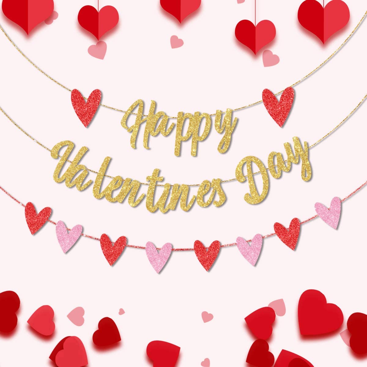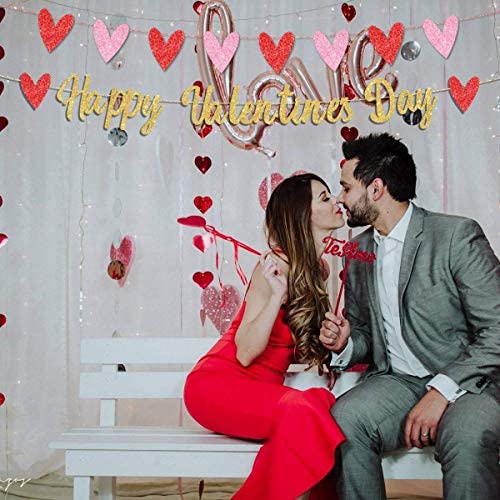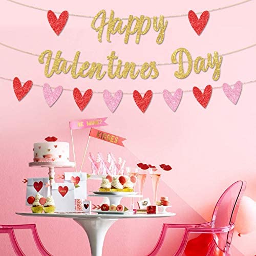 Happy Valentineu2019s Day Banner Gold Glitter Heart Banner Garland 3 Pieces Valentineu2019s Day Party Decorations for Home School Room Decoration Wedding Party Supplies