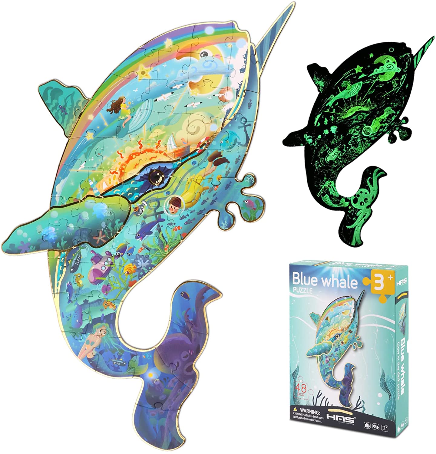 HAS Floor Puzzles for Kids Ages 3-8, Whale Shape Puzzle, Glow in The Dark, Colorful Ocean World Puzzles, 48 Pieces Children Jigsaw Puzzle for Boys and Girls Gifts