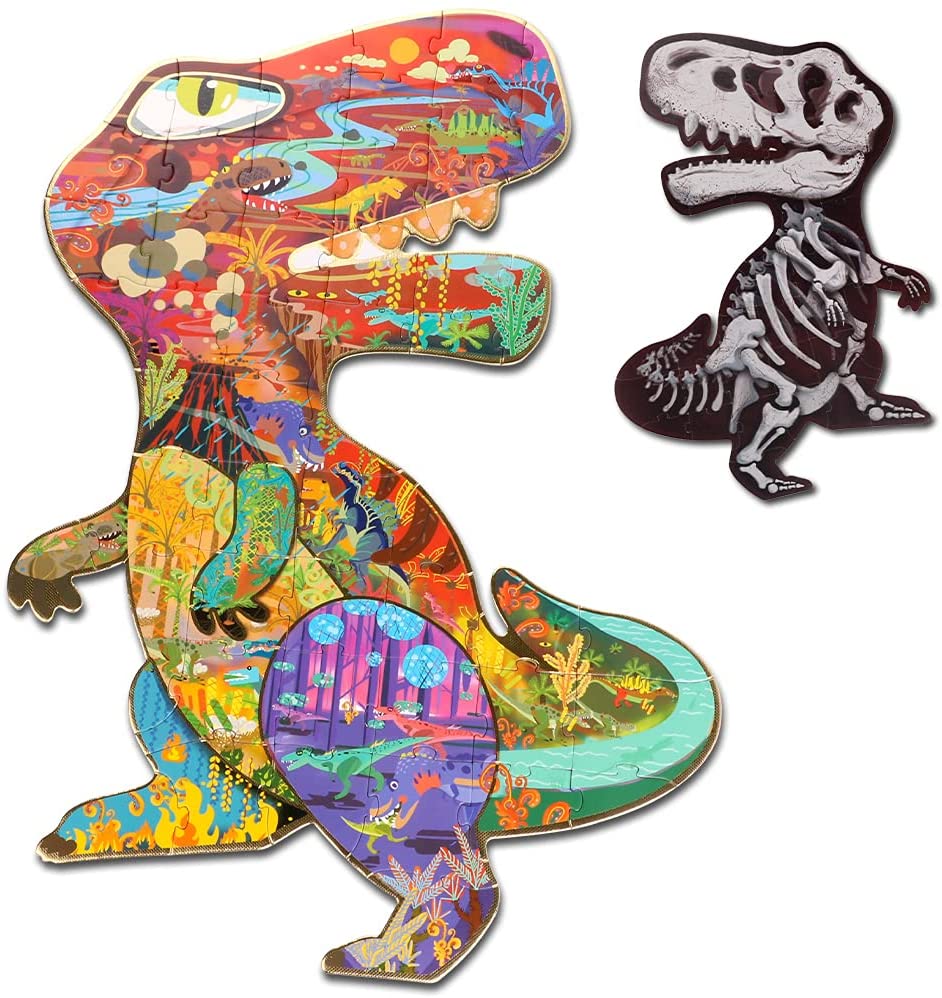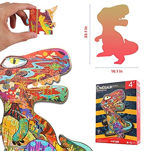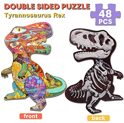 [Double-Sided Irregular Puzzles]- The 48-pieces dinosaur puzzles have double-sided puzzles of different styles, The front is a colorful dinosaur world, and the back is a unique dinosaur fossil shape. The two sides have different challenges and difficulties. The skeleton perspective pattern on the back is nuanced and more difficult! Come and challenge different fun! [Unique Shape and Pattern Design]- This childrens puzzle has innovative and unique irregular shape. The domineering shape of Tyrannosaurus will definitely be loved by kids. The frontal pattern design has visual creative surprises, the mysterious ancient forest, and different kinds of dinosaurs, allowing you and your children to fully enjoy the dinosaur world! [Advanced Material]- This floor puzzles use advanced technology. The pattern of the kid puzzle uses four-color printing, and the outline edge is added with foil stamping. The surface of the puzzle uses embossing technology and 3D solid particles. The pieces of the puzzle are smooth and burr-free, the quality can be guaranteed! [Good for Brain Development]- This jigsaw puzzle has a variety of ways to play, which can expand the childs brain to the greatest extent. According to the dinosaurs limbs and contours, according to different patterns and content, or according to the back bone perspective puzzle, different gameplay can effectively promote childrens Hand-eye coordination, develop the ability to solve problems! [Great Gift for Kids]- The dinosaur puzzle has large sturdy pieces puzzle for children 4+. HAS is committed to creating innovative and interesting childrens toys, we believe your child will love this gift, if you have any questions you can always contact us, we will definitely solve the problem for you!