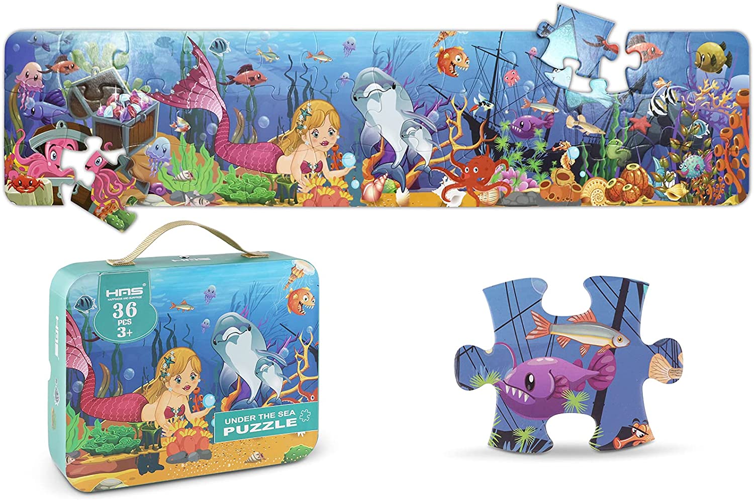 [Ideal Puzzle Game for Kids]- The 36 piece puzzle is perfect for ages over 3 to complete on their own or with a little help of parents. The mermaid puzzles have a high quality sheen , the colorful puzzles can enhance childrens color sensitivity. Finished Size 38.37x 8.85 inch. [Good for Brain Development]-The floor puzzles are suitable for children to improve brain intelligence, exercise hand-eye coordination and observation skills, not only provide children with interesting game time, but also help them practice problem solving and spatial reasoning during the completion of the puzzle. [Quality Upgrade]- We have upgraded the quality of this childrens puzzle, the puzzle pieces are stronger and more durable, no delamination, no burrs, the surface pattern is more lustrous, and the quality meets all safety standards. [A EXQUISITE GIFT ]- Girls will love the mermaid theme of this exciting puzzle. Playing puzzles and brainstorming with friends can build a closer relationship with them and create a pleasant atmosphere. And the puzzle box has a hand strap, which is convenient to carry and is very suitable as a gift.