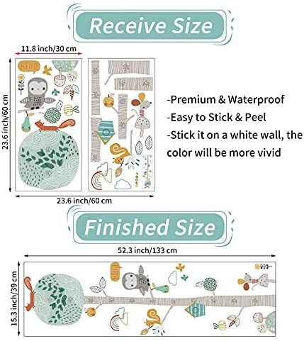 High Quality Material: Our cartoon animal height measure wall stickers are made of premium vinyl PVC, which is removable, durable, environmental, non-toxic, non-fading, waterproof and safe to use, let you baby enjoy a healthy and happy growth! Our wallpaper is translucent, so it is best to stick it on a white wall which would look much prettier. Record Kids Growth: Children can measure height by themselves easily, allow your child to enjoy every moment of their growth. And they will be more concerned about their height, actively adjust diet and increase exercise. Let our baby growth chart ruler help you keep track of all of your child’s height milestones, from birth and beyond! Unique Pattern Design: The vivid patterns with tree, jungle, flower, rainbow, animals include squirrel, owl, bird, mouse and bee as embellishment add a unique highlight to the blank space, bring a multicolored color to the wall, let the wall become vivid and lovely. This decorative wall sticker is not only a fun way to decorate your kids room, but also a great educational tool. Wide Application: As a perfect room decoration, it can be used on any smooth, dry and clean surfaces like living room, childrens room, nursery room, bedroom, bathroom, school classrooms, doors, windows, mirrors, walls, furniture, baby girls and boys room. Good partner for flawed wall, cover the damaged part of the wall. It also can be a great gift for birthday, festival Christmas and party. What You Get: Our package contains 2 sheets jungle hanging ruler wall decals which can make a big wall sticker. Each sheet size is about 23.6x 11.8inches, the finished size is about 52.3 x 15.3inches. With these sufficient quantity and suitable size, you can DIY according to kids preferences and your imagination to make the room more adorable.