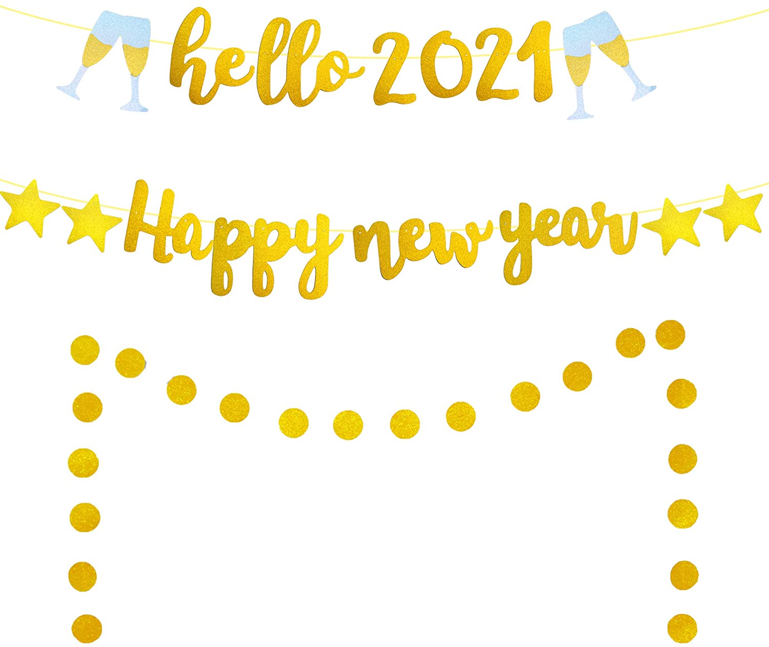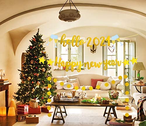 Hello 2021 Happy New Year Banner, Gold Glittery New Year Banner, Hello 2021 Banner, Gold Glittery Circle Dots Garland for 2021 New Years Eve Party …