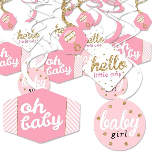 Hello Little One – Pink and Gold – Girl Baby Shower Hanging Decor – Party Decoration Swirls – Set of 40