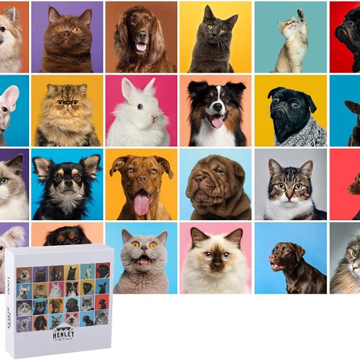 This colorful jigsaw puzzle features a collage of portraits of dogs, cats, and a fluffy, white rabbit. This large puzzle has 1000 pieces that are made out of durable, gray paper material. The completed puzzle measures 19.6 x 27.5 inches. A vibrant reference poster of the completed puzzle image is included in the box. The poster measures 16.1 x 11.4 inches; large enough to hang on the wall and enjoy. On the back of each puzzle piece is a letter that will help you sort the pieces into specific sections. The bag that the pieces that come shipped in is resealable for easy storage and re-use. The back of the puzzle box contains fun facts about the puzzle itself. Box dimensions 7.8 x 7.8 x 2.4 inches.