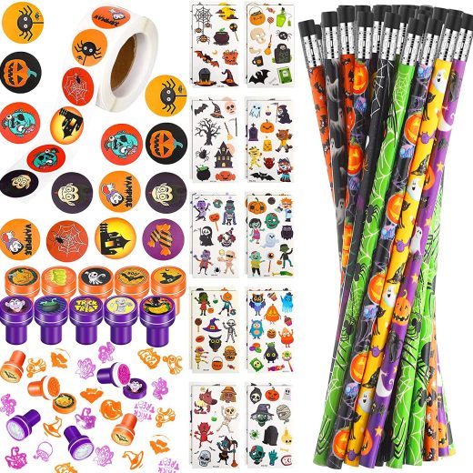 Hicarer Halloween Stationery Set 20 Pieces Pumpkin Stampers, 20 Pieces Halloween Pencils, 20 Sheets Halloween Tattoo, 500 Pieces Stickers, Halloween Party Favors Stationery Kit for Boys and Girls
