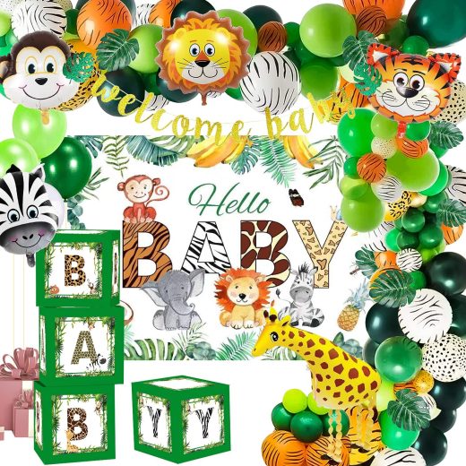 HIPEEWO Safari Baby Shower Decorations – Jungle Theme Party Supplies Include Leaf, Boxes, Banner, Backdrop, Balloons Garland Arch, for Welcome Baby Animal Gender Birthday Party Decor for Boy Girl