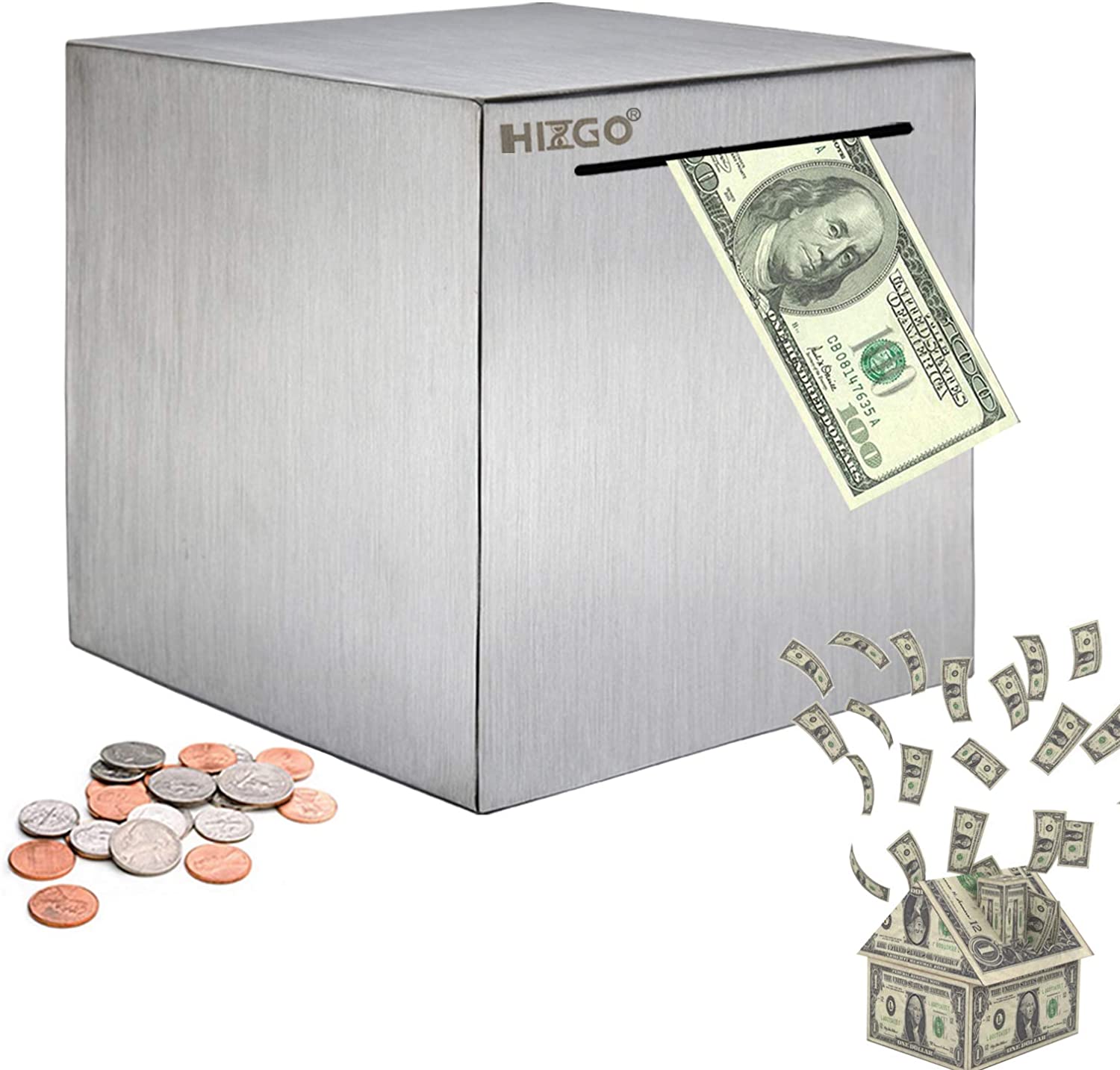 Quality Material This piggy bank is made of stainless steel material, Through our strict selection of materials, cutting, welding, polishing, sanding, and elaborate production of this high-quality piggy bank, It has a smooth appearance and is very textured Unexpected Surprise The money banks are completely closed 6 sides, so the money box can only save money but cannot be taken out, a 4.7-inch Cube money bank can store 500 banknotes. Because the piggy bank kit is difficult to open, it is recommended to open it only when the target is completed, or in some emergency situations, once the piggy bank is opened, it is also destroyed, Cannot be used again For Everyone This piggy bank is not only for adults but also for a childrens toy. It can be used by children, teenagers, and the elderly. Particularly suitable for some people who do not have strong self-control. Constrain yourself to save money, or prepare a savings plan. You can save money to realize your wishes, and you wont be interrupted because you can not take them out at any time Amazing Gift Can be used as a gift to lover and set a goal with your lover. The perfect gift for a new baby or birthday gift, you can make a money-saving plan for your new baby, or let them set a saving goal for their babys birthday. It is not only cool toys for boys, but it is also fun gifts for girls. Because you can use our free stickers, paste-up your favorite language or special dates on the piggy bank About Withdraw Because the strong piggy bank is difficult to open, it is recommended to open it only when the target is completed, or in some emergency situations. Once the piggy bank is opened, it is also destroyed. When you want to open it, please refer to the operating instructions in our pictures, if you have any questions, please feel free to consult us