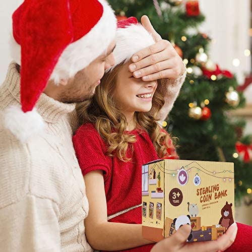Perfect Kids Gift – Still no idea to choose which present for your lovely child How about this adorable piggy bank which can help you children save money efficiently and build the habits of financing in the early age. Great gift for kids birthday and the coming Thanksgiving and Christmas. Upgrade Voice Design – Unlike other kids money bank, this latest version coin bank features clear voice function : When you put the coins on the plate, the kitten or the panda will say a clear Hello . After taking away your money, it will say Thank you, bringing much more fun to the children. Large Capacity – This Stealing Money Bank measuring 4.7*4.1*3.7 inch, work on all US coins can hold approximately 30 or 40 coins. This smart coin bank can be your first choice to teaching kids how to save money. How do they steal – Ask your little kid to put one coin on the top of button then press it. The kitty of this automatic stealing money bank would head up and steal it. You can find more info about how this kitty “steal” money from the description. Worry-free – We guarantee you 100% satisfaction that this automatic coin bank is made from totally environment-friendly material under most strict quality inspection and our friendly customer service will always be your side if you have any questions.