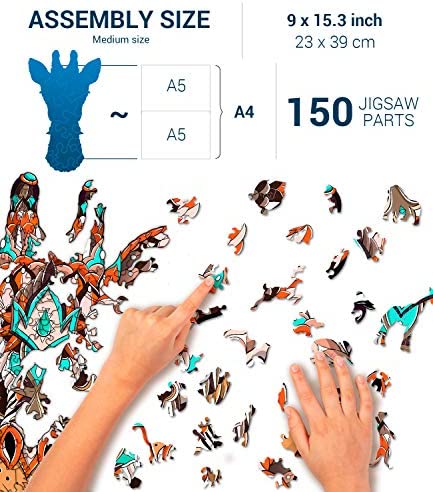 Wooden Animal Shaped Jigsaw Puzzles – Expert Level Assembling, Hard Assembly Level (4 stars with 5), 4-5 hours of Assembling, 12+ years, Natural Wood, 9×15.3 inch,(23x39cm),130 pcs, L – Size, Giraffe Only Natural Materials: High quality components are used in our animal shapes jigsaw puzzles. The set includes 130 unique shape wooden pieces that are 100% eco-friendly. Thickness of each single majestic piece is 4mm which makes them very pleasant to touch yet hard to break. Some of the wooden pieces have animal shape, this makes the puzzling time more fun and enjoyable. In order to help you with the challenge of puzzling, we have put a reference picture in the packing tube. Makes a Perfect Gift: These majestic wooden jigsaw puzzles make a perfect gift for holiday: Christmas, Birthday, Father’s day, Mother’s day, Anniversary, Thanksgiving, Halloween, Friendship day and graduation. This is the best gift for kids and adults as you not only giving a wooden puzzle, but you are also giving an emotion. Puzzling is a wonderful journey full of interesting. Surprise and delight yourself or your friends and family with an brain teaser of Puzzling Giraffe Animal in Puzzles! Decorate Your Room: Gorgeous colors and details of the 3d animal puzzle can be a perfect decoration for your bedroom, kitchen or living room. Huge Benefits for all Ages: It`s great for Kids as it helps them to Improve fine motor skills, basic cognitive abilities hand-eye coordination, shape recognition, and, most importantly, problem-solving skills. Wooden animal jigsaw puzzles are effective in keeping the child busy and engaged in a productive way. These 3d wooden puzzles are unique in shape and majestic design, lightweight and kid-friendly. Adults use it as a way to relieve stress after a long day at work and change the activity. High Quality Guaranteed: We stand behind our products and we do our best to provide the highest level of product and service. Every puzzle comes with a 30-day period No Question Asked 100 Percent Refund. If any piece chipped, broken or missing, please contact us to replace. Our lovely support is available 24/7!