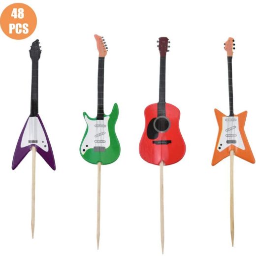 BEST PARTY CAKE DECOR: The guitar cupcake toppers are the perfect choice for cake decorations of various theme parties, graduation, wedding birthday, baby shower, tea party, Christmas, valentines and kid birthday cupcake picks, etc WIDE USAGE: The guitar cupcake toppers are designed with bamboo toothpicks, very safe for putting them on cakes, cupcakes, ice cream, fruits, cheese, any dish you want to decorate. Just plug on the cake directly to make your decoration more pretty and warm HIGH-QUALITY MATERIAL: Paper+Bamboo. The guitar cake toppers are made of paper, designed with a good cutting process PACKAGE INCLUDE/SIZE: Pack of 48 Guitar Shape Cupcake Toppers. SIZE: Length Approx 4.6inch ATTENTION: Designed for single-sided. Only for decoration purposes, Not edible, and please do NOT place in oven. Any question will be solved within 24 hours