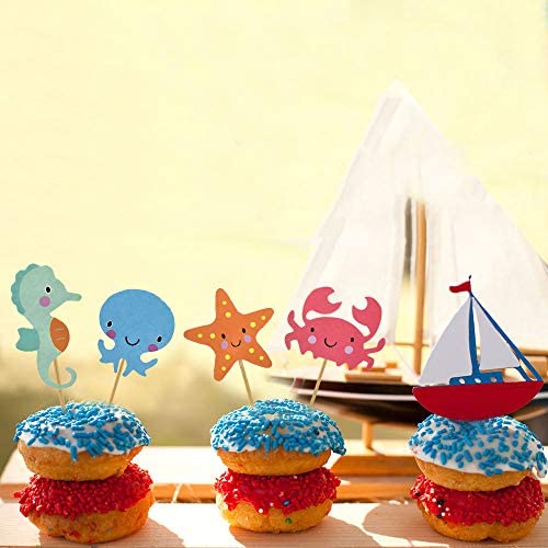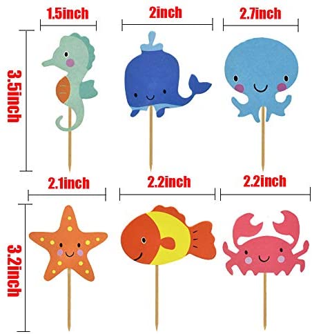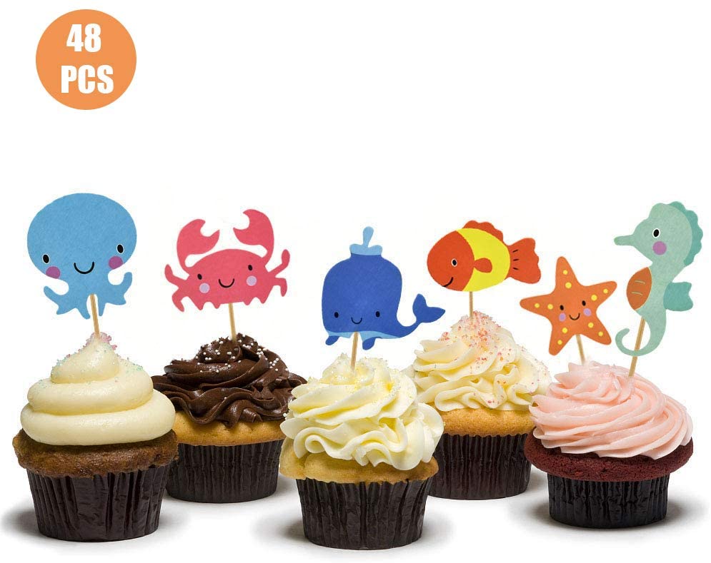 PACKAGE INCLUDE/SIZE: Pack of 48 Ocean Theme Cupcake Toppers. Including 6 types (Dolphin Starfish Seashell Fish Crab Octopus). SIZE: Length Approx 3.2-3.5inch. HIGH QUALITY MATERIAL: Paper and bamboo. The cake toppers are made of paper, adorable designs with good cutting process. WIDE USAGE: The ocean theme cupcake toppers are designed with bamboo toothpick, very safe for putting them on cakes, cupcakes, ice cream, fruits, cheese, any dish you want to decorate. Just plug on cake directly to make your decoration more pretty and warm. PERFECT PARTY DECOR SUPPLIES: The sea animals theme cupcake toppers are perfect for celebrating your ocean nautical theme party, wedding, birthday, kids party, summer party, bachelorette, baby shower, engagement, or more other theme party decor. WARM NOTICE: Cupcake toppers are for decoration purposes only. Not edible and please do NOT place in oven. Please note that these cake toppers are double-sided.