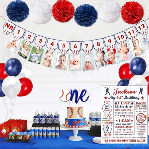Hombae Baseball Birthday Party Decorations, Baseball 1st Birthday Monthly Photo Banner Cake Toppers, Balloons, Pom Poms for Baseball Sports Theme Party.