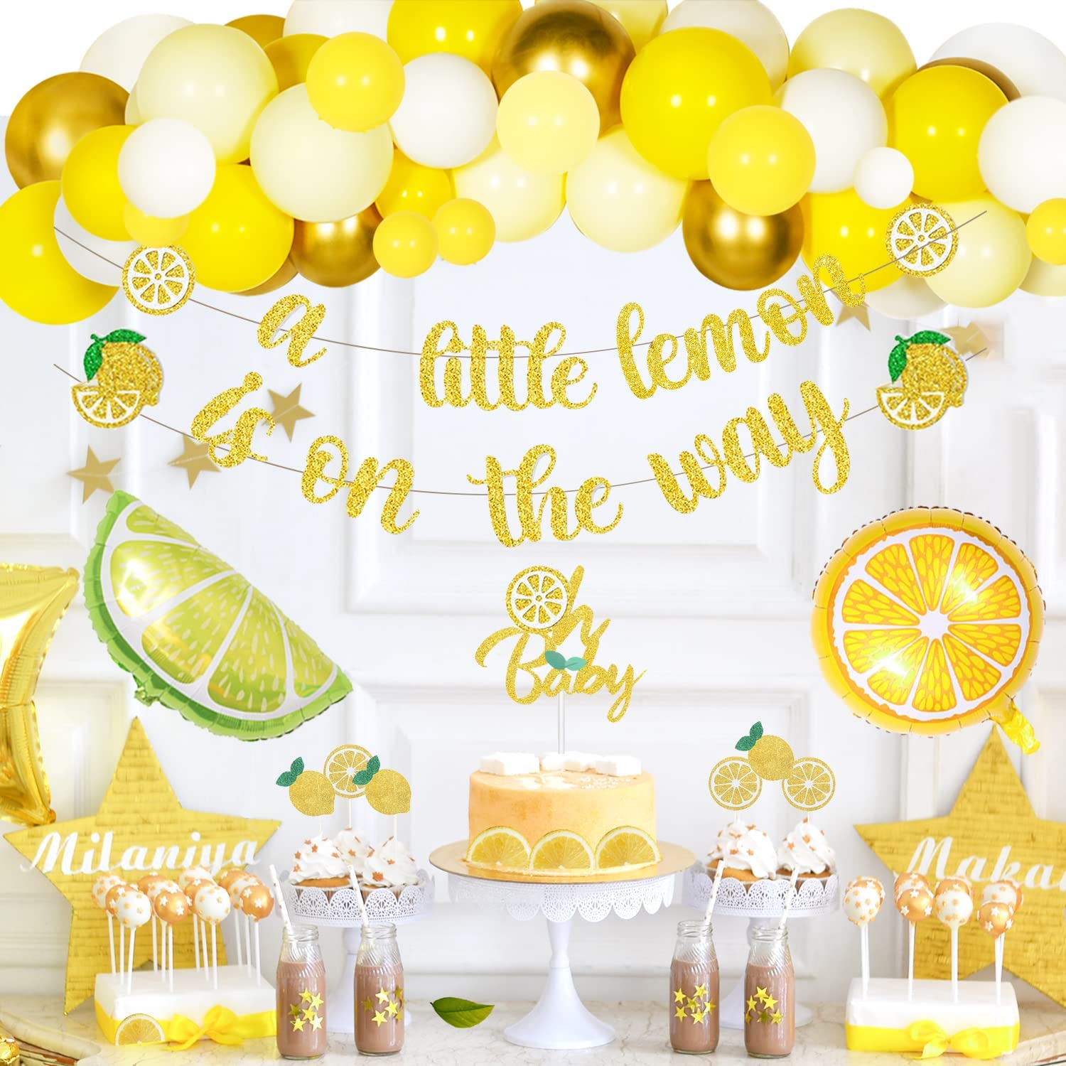Occasion Lemon Baby Shower Party Decorations Color Yellow Included Components 1 x A Little Lemon is on the Way Banner with two cute lemon patterns, 1 x Oh Baby Cake Topper, 6 x Lemonade Glitter Cupcake Toppers, Yellow Balloons Garland includes 45 assorted sizes eco-friendly latex balloons, 2 pcs lemon foil balloons, 1pc balloon garland strip, 1pc tying tool, glue dots. See more Theme Lemon Baby Shower Party Decorations Material Rubber Hombae CPSIA Cautionary Statement Choking Hazard – Balloon